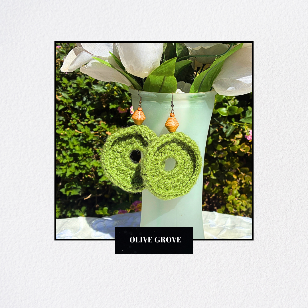 Add a bold, unique touch to your look with these handcrafted crochet earrings, made from soft acrylic yarn in a gorgeous olive green shade. Each pair is accented with your choice of:
